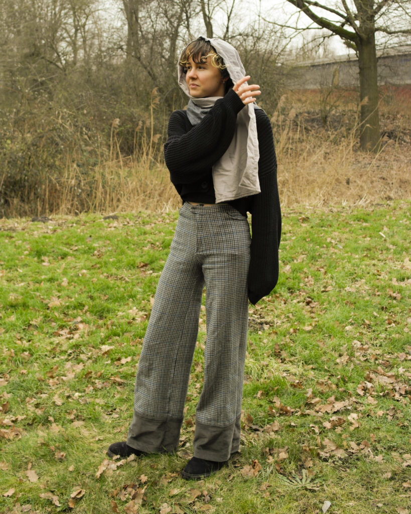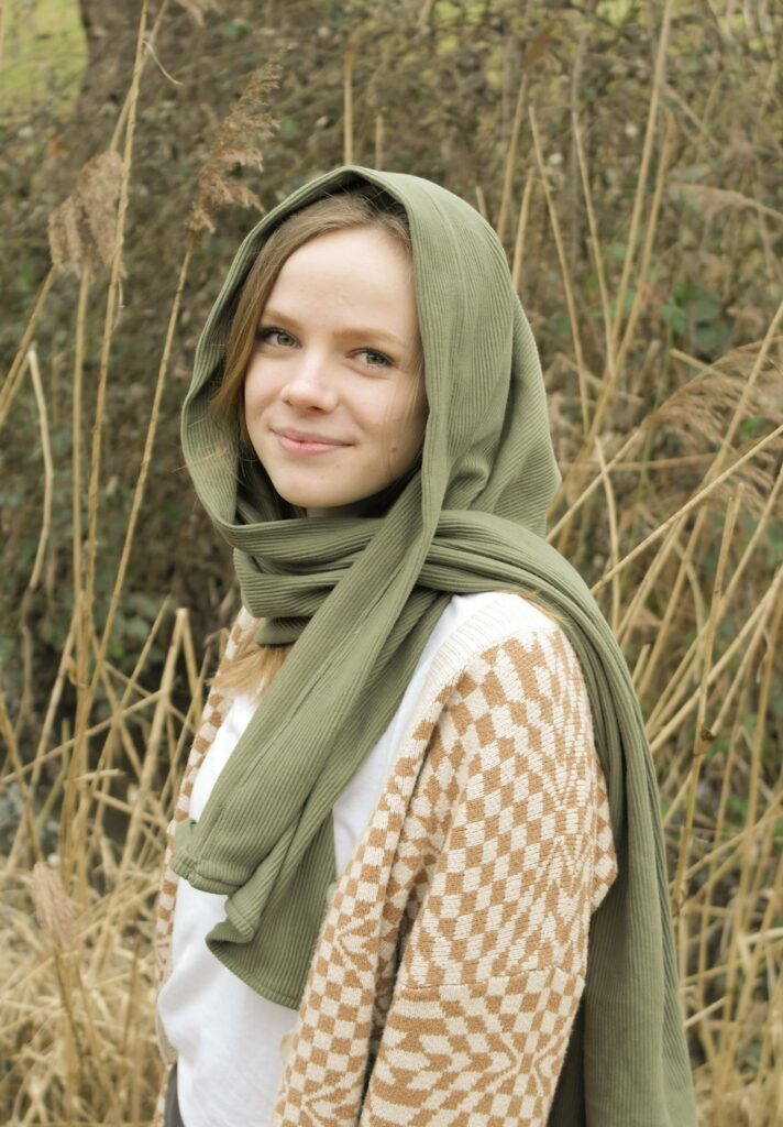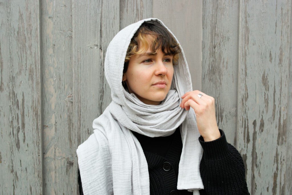 Mir war wichtig, dass man ihn gut als Schal tragen kann und dann keine fette Kapuze den Rücken runter hängt, aber er dennoch hält, wenn man ihn so tragen möchte.