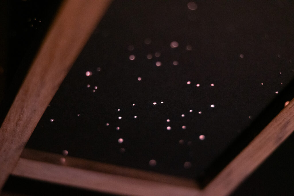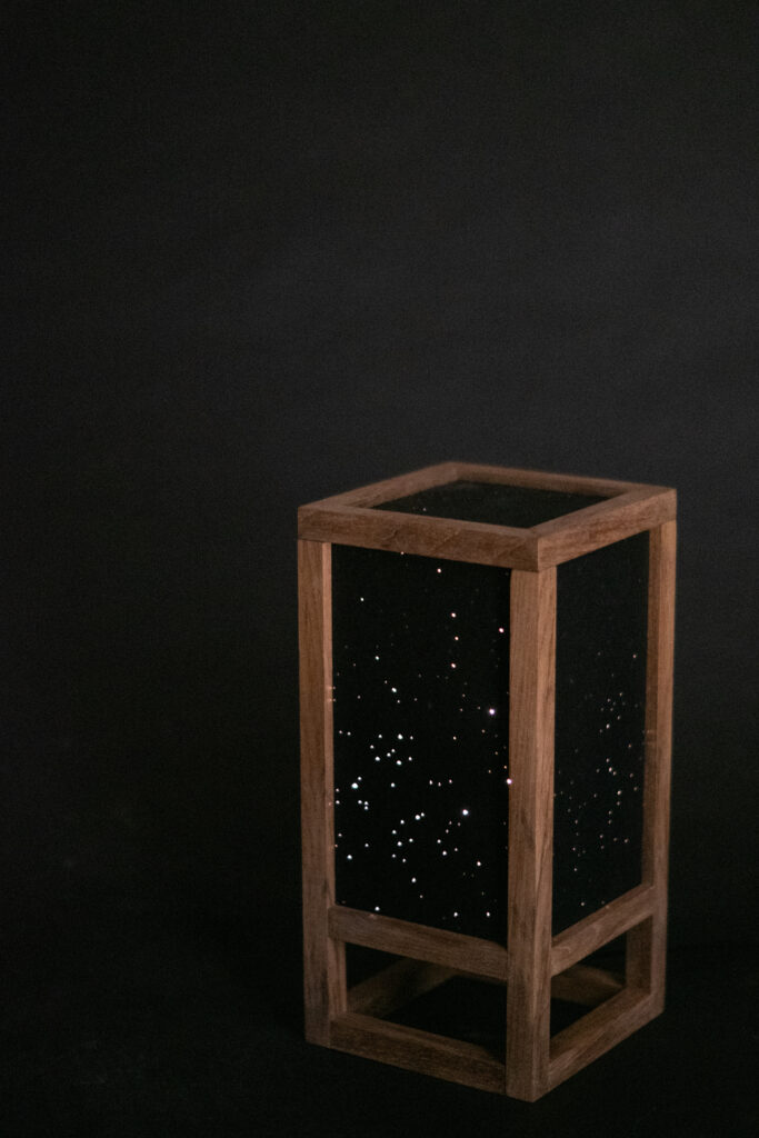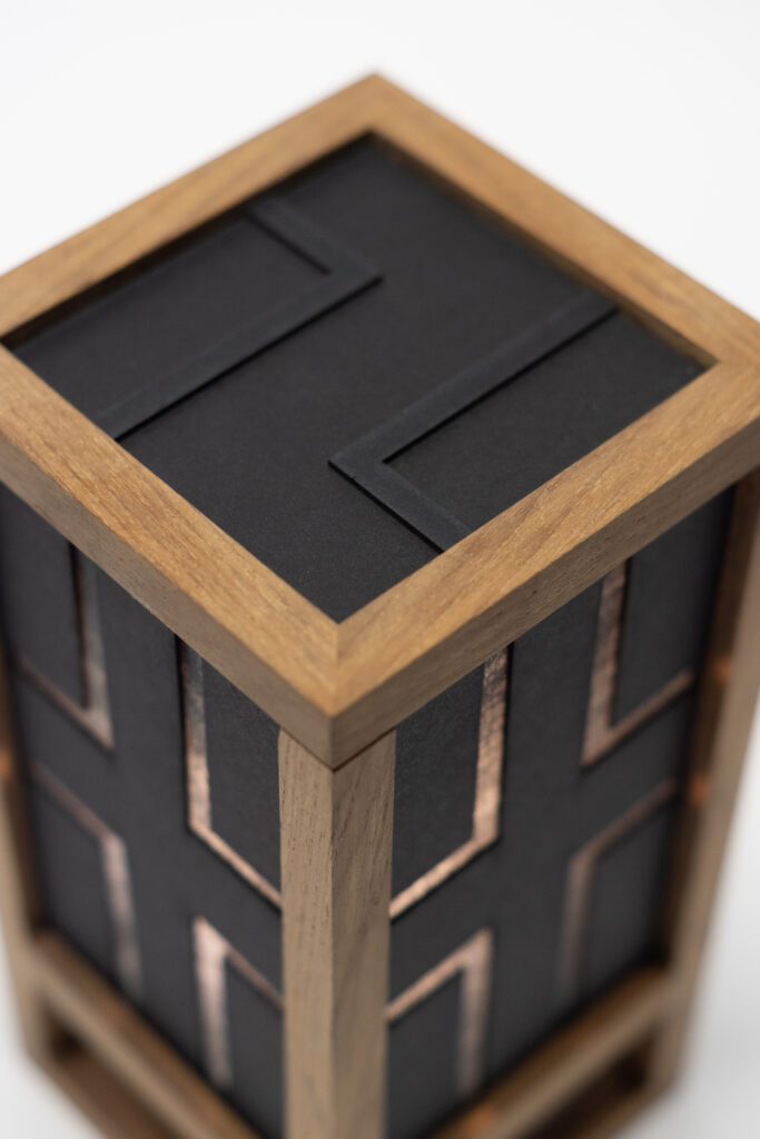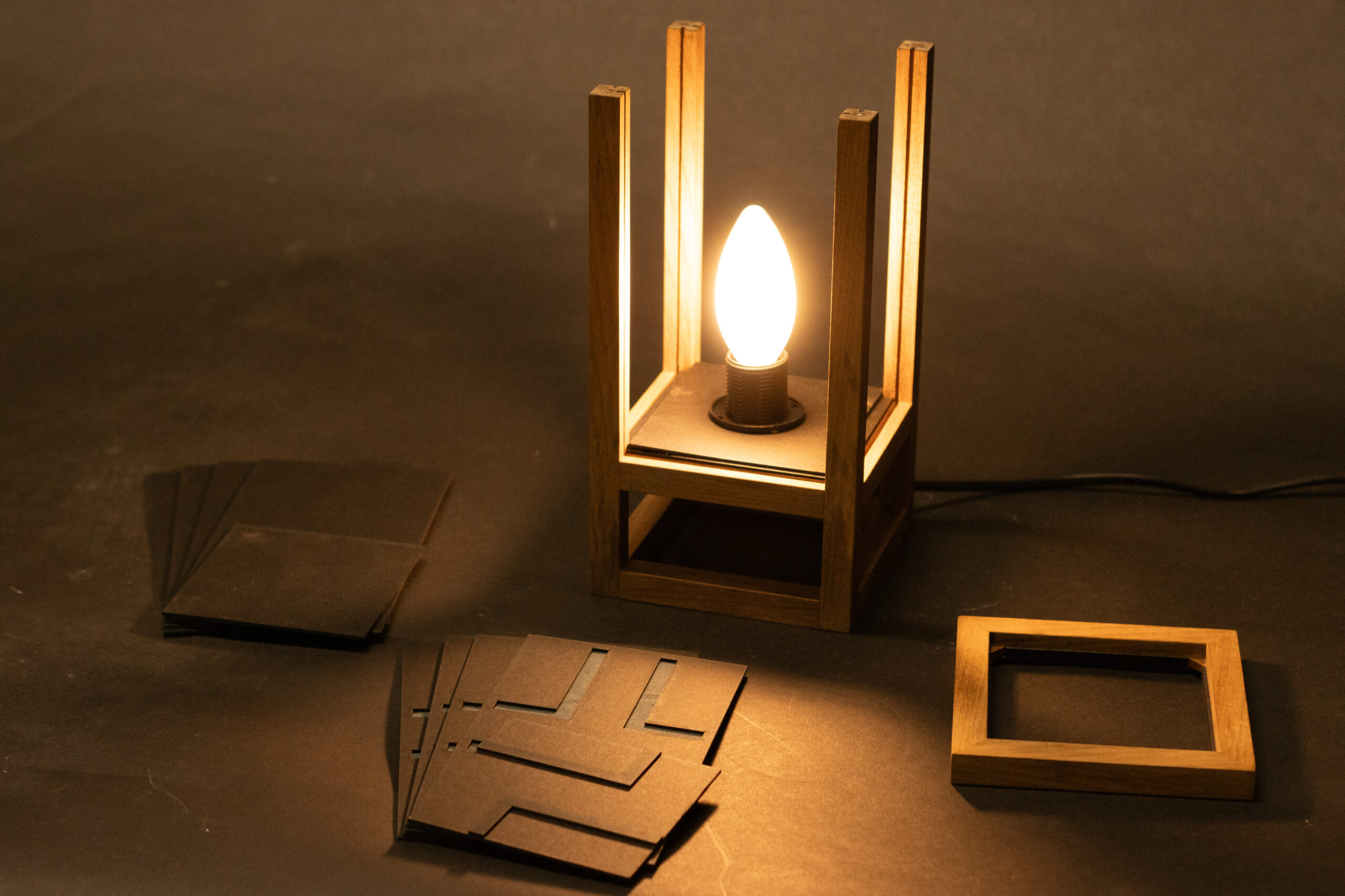 ATMO ist eine atmosphärische Leuchte, die angepasst werden kann. Die Holzleisten haben feine Nuten, in die dicke Pappe mit ausgelaserten Formen eingeschoben werden. Der Deckel findet mit kleinen Magneten schnell seine Position und die Deckelplatte lässt sich einfach einlegen.